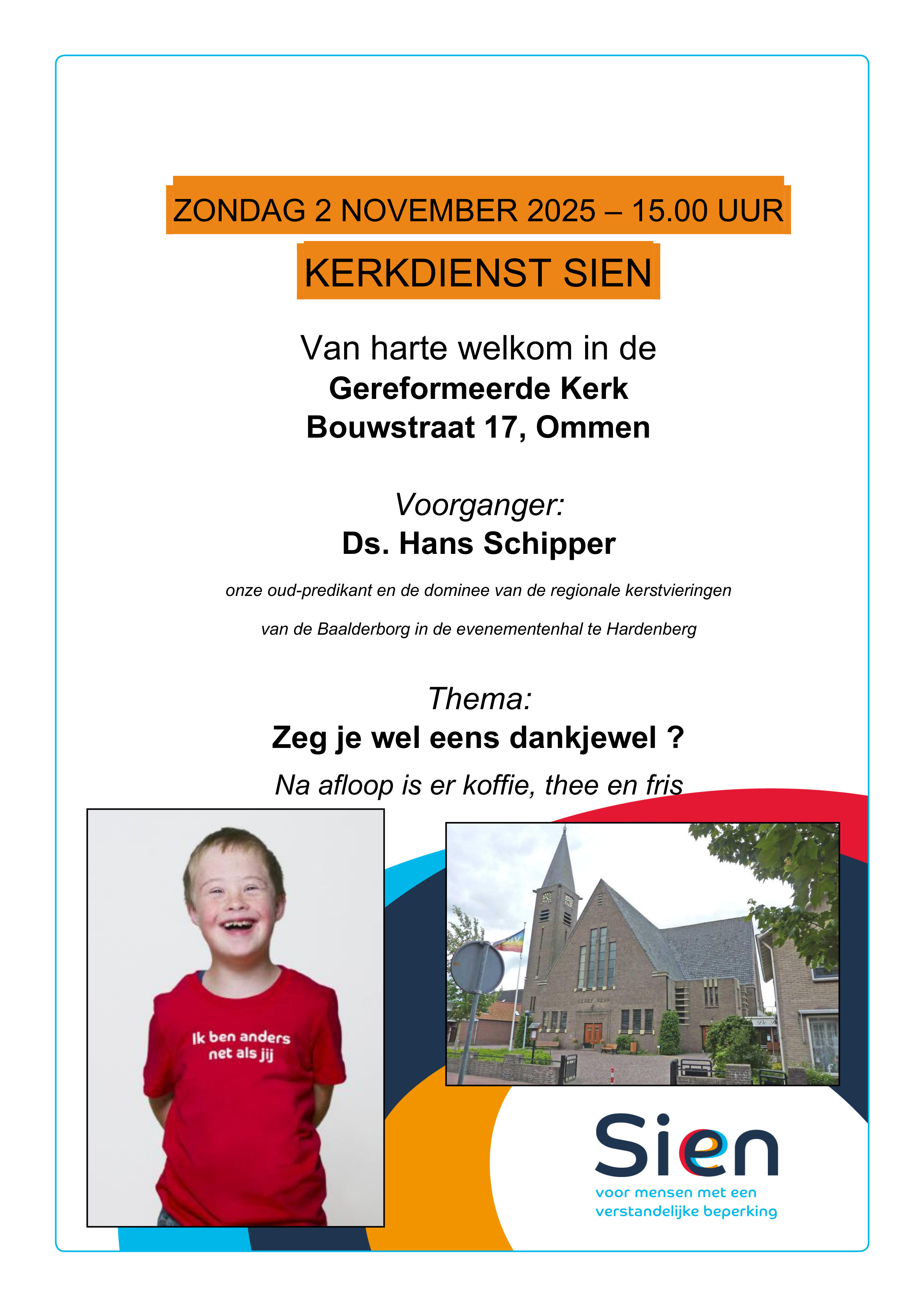 D.V. zondag 2 november 2025 is er om 15.00 uur in de Gereformeerde Kerk, Bouwstraat 17 te Ommen een aangepaste kerkdienst, welke wordt georganiseerd door Sien – Regio Ommen. Mensen uit de regio zijn welkom in deze speciale dienst. Wij hopen u ook in Ommen te ontmoeten. Er zijn weer voldoende muziekinstrumenten aanwezig om zelf muziek te maken. Voorganger is dominee Hans Schipper, onze oud-predikant en de dominee van de regionale kerstvieringen van de Baalderborg in de evenementenhal te Hardenberg. Het thema is: “Zeg je wel eens dankjewel?” Deze dienst is voor iedereen, wie of hoe je ook bent. Allemaal van harte welkom. Na de dienst is er gelegenheid om na te praten onder het genot van koffie, thee of fris. Voor meer informatie over Sien op www.sien.nl ![]() |