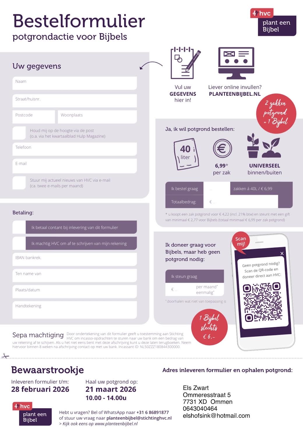 Bestel potgrond, help vervolgde christenen Miljoenen vervolgde christenen beschikken niet over een eigen Bijbel. In hun land is het bezit van een Bijbel verboden of zijn ze te arm om er zelf één te kunnen kopen. Daarom organiseert Stichting HVC (Hulp Vervolgde Christenen) ieder voorjaar de potgrondactie ‘Plant een Bijbel’. Deze landelijke actie werkt eenvoudig: u bestelt vóór 28 februari uw potgrond (40L € 6,99) bij HVC en met de opbrengst ontvangen vervolgde christenen in onder andere Afghanistan, Nigeria, China, Soedan en Pakistan een eigen Bijbel. Hebt u geen potgrond nodig? Dan kunt u ook bijdragen door een Bijbel te sponsoren. Voor zes euro voorziet u iemand al van een eigen exemplaar. Bestellen of doneren kan via www.planteenbijbel.nl. Als u liever niet online wilt bestellent, kan het ook via een bestelformulier. Deze hebben wij beschikbaar, dus vraag hier gerust om. Ingevulde formulieren kunnen weer bij ons ingeleverd worden. Een bestelling per e-mail of WhatsApp is ook mogelijk. Zie hiervoor onze contactgegevens onder dit bericht. Afhalen aan de Ommeresstraat 5 in Ommen Bij het bestellen kunt u ons adres kiezen als afhaalpunt. Op D.V. zaterdag 21 maart staat de potgrond tussen 10.00 en 14.00 uur voor u klaar. Kunt u niet komen? Neem gerust contact op: dan zoeken we een oplossing. Met de opbrengst van twee zakken potgrond kan al één Bijbel worden verspreid. Hoeveel Bijbels maakt u mogelijk? Lees meer op: www.planteenbijbel.nl Egbert Jan en Els Zwart Ommeresstraat 5, Ommen 06-48775995 (Egbert Jan) / 06-43040464 (Els) elshofsink@hotmail.com