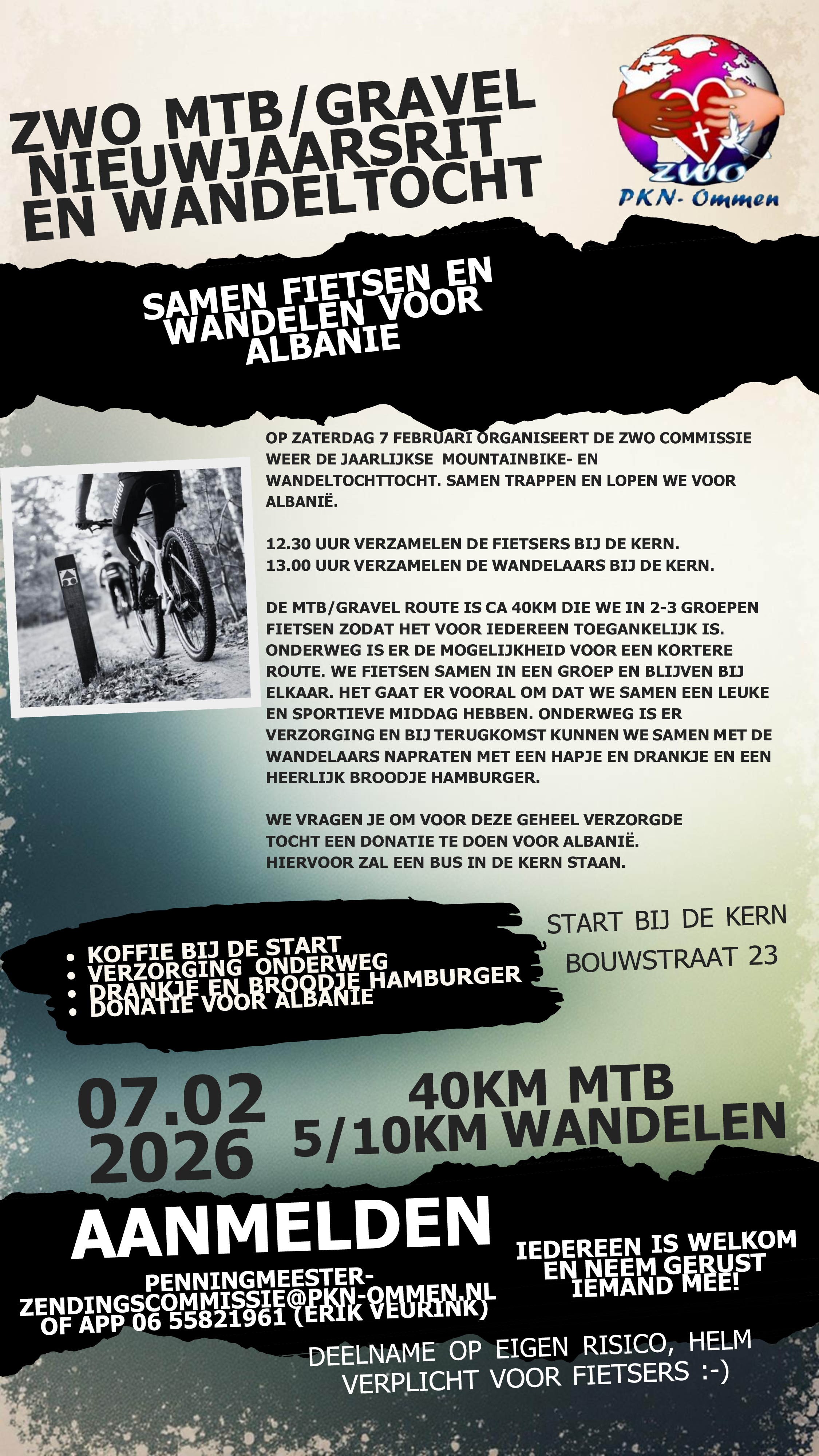 p zaterdag 7 februari organiseert de ZWO commissie weer de jaarlijkse mountainbike- en wandeltochttocht. Samen trappen en lopen we voor Albanië. Om 12.30 uur verzamelen de fietsers bij De Kern. Om 13.00 uur verzamelen de wandelaars bij de Kern. De mtb/gravel route is ca 40 km. die we in 2-3 groepen fietsen zodat het voor iedereen toegankelijk is. Ook is er de mogelijkheid voor een kortere route. We fietsen samen in een groep en blijven bij elkaar. Het gaat er vooral om dat we samen een leuke en sportieve middag hebben. Onderweg is er verzorging en bij terugkomst kunnen we samen met de wandelaars napraten met een hapje en drankje en een heerlijk broodje hamburger. We vragen je om voor deze geheel verzorgde tocht een donatie te doen voor Albanië. Hiervoor zal een bus in De Kern staan. Aanmelden via penningmeester- ![]() |